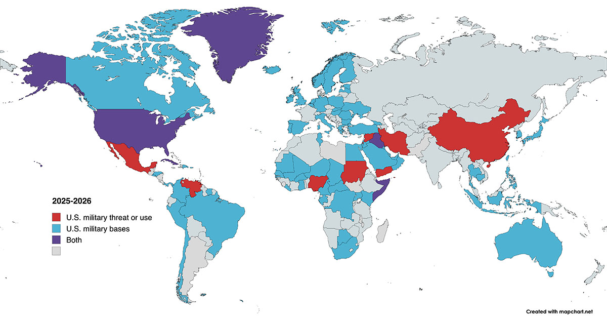 coloreados en azul o morado tienen bases militares estadounidenses en su
