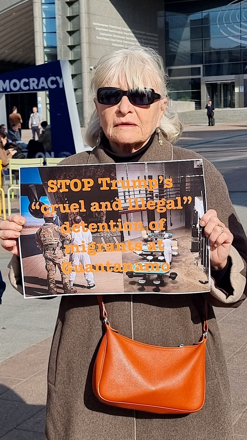 Una foto de la vigilia de Bruselas con el cartel de Andy pidiendo el fin del uso de Guantánamo por Donald