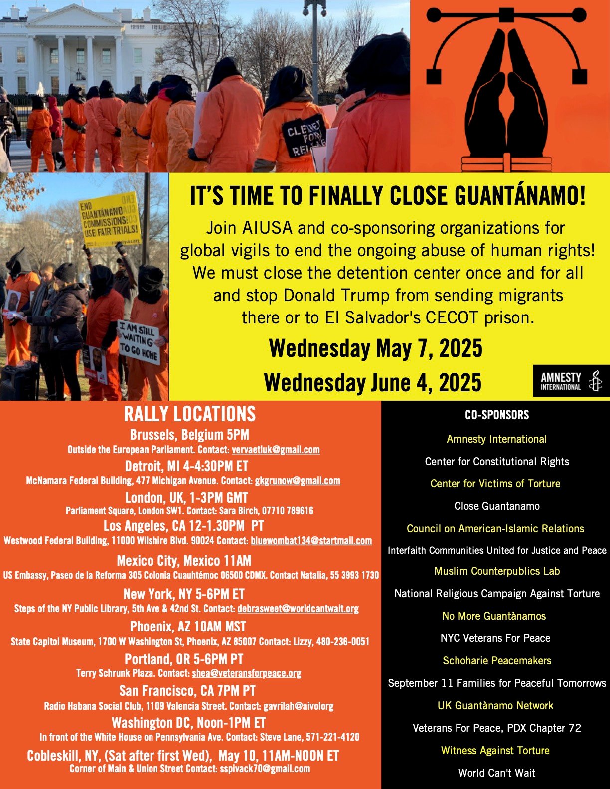 Las vigilias mensuales "Close #Guantanamo" continúan este miércoles, 7 de mayo, en once