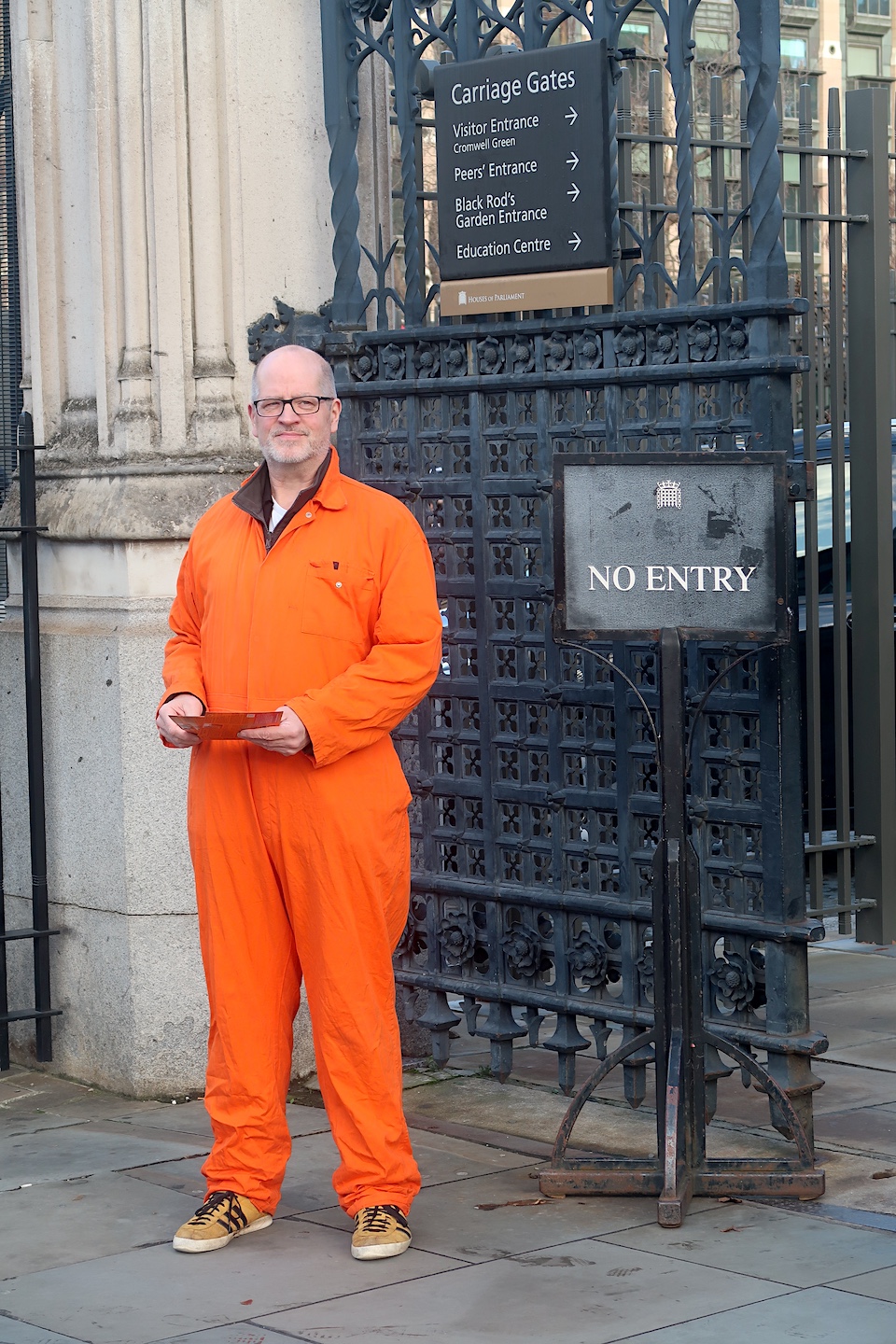 David en la vigilia de Londres repartiendo folletos a la entrada y salida del Parlamento. (Foto: Andy Worthington).