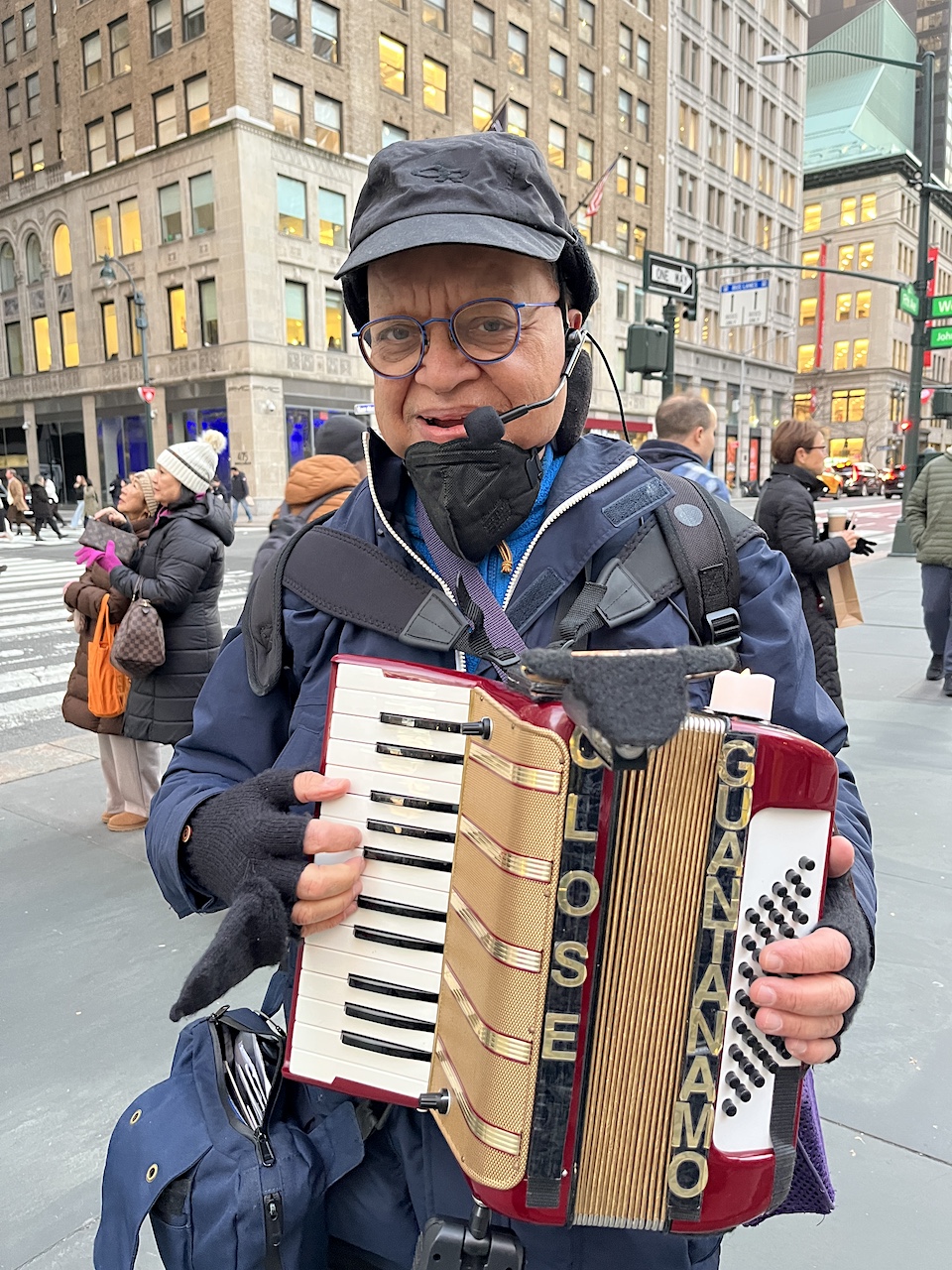El acordeonista Paul Stein en la vigilia celebrada en Nueva York, con su instrumento adornado con un
