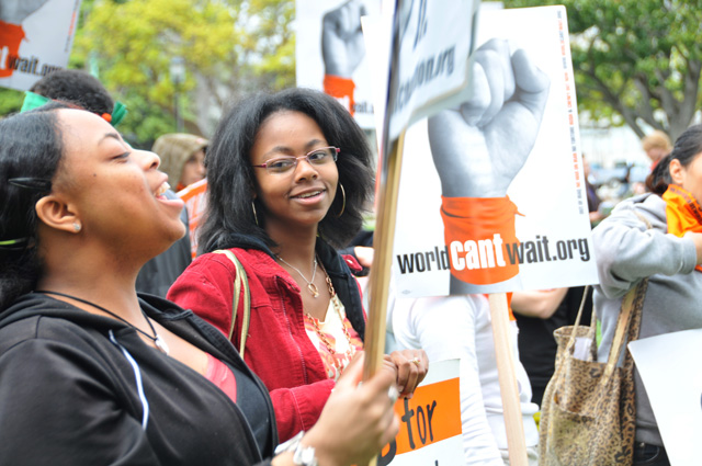 activistas de El Mundo no Puede Esperar para pedir un pañuelo de color naranja,