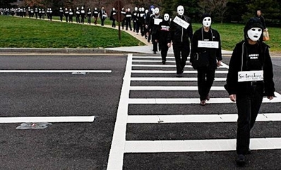 manifestantes vestidos de negro y con máscaras blancas para simbolizar la