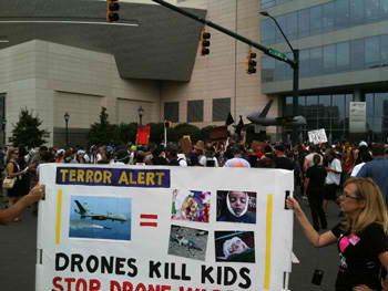 empezaron a corear '¡Los ataques de los aviones no tripulados son crímenes de
