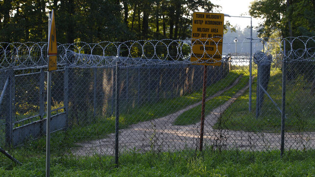 Una cerca de alambre rodea una zona militar en el pueblo de Stare Kiejkuty, en el