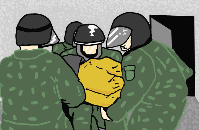 básicamente en que un equipo de guardias con equipo antidisturbios entra a una