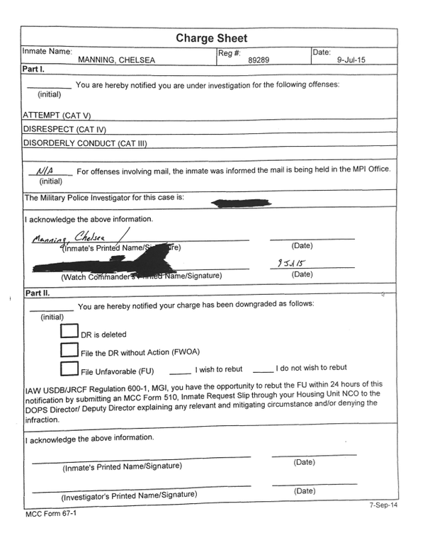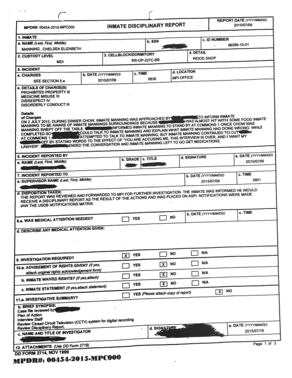 Manning es acusada de violar cuatro reglas: “faltar el respecto” y “conducta indisciplinada”, porque tiró comida al suelo y, cuando un guardia la confrontó, pidió hablar con su abogado; tener “propiedad prohibida” (libros y revistas); y hacer “mal uso de la medicina”, por la pasta de dientes caduca.