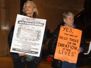 Peaceful Tomorrows sosteniendo un letrero de CLOSE GTMO habló para los demás manifestantes y el público de la