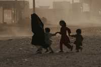 Una anciana afgana y sus nietos escapan en el centro de Herat poco antes de
