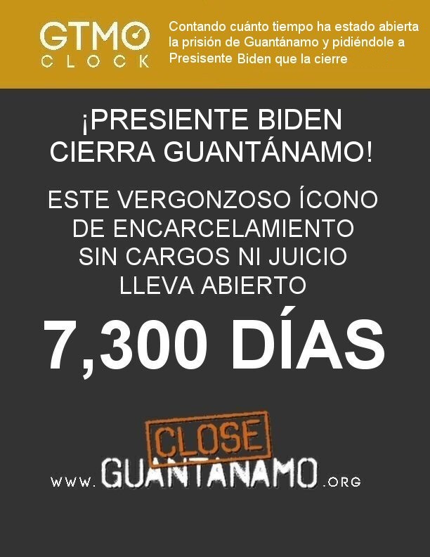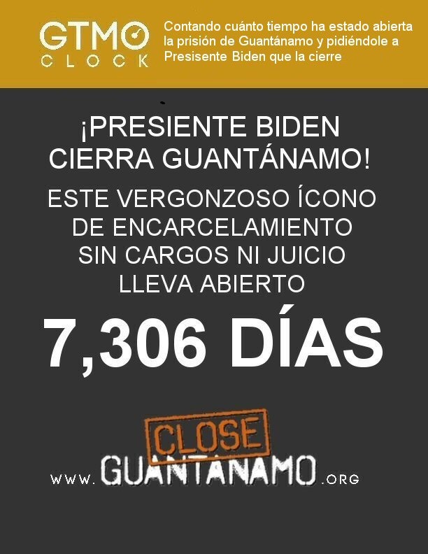 el 5 de enero de 2022 y 7306 días el 11 de enero de 2022 (el 20º aniversario de la apertura de Guantánamo) y envíanosla a: info@closeguantanamo.org.