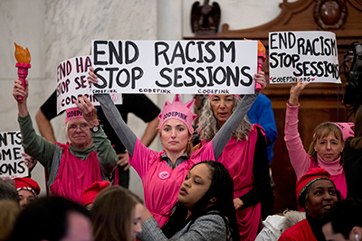 Code Pink a la audiencia de confirmación de Jeff Sessions. Foto: AP