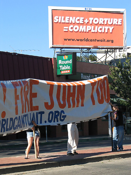 de Abogados y El Mundo no Puede Esperar. Los manifestantes exigían que John Yoo