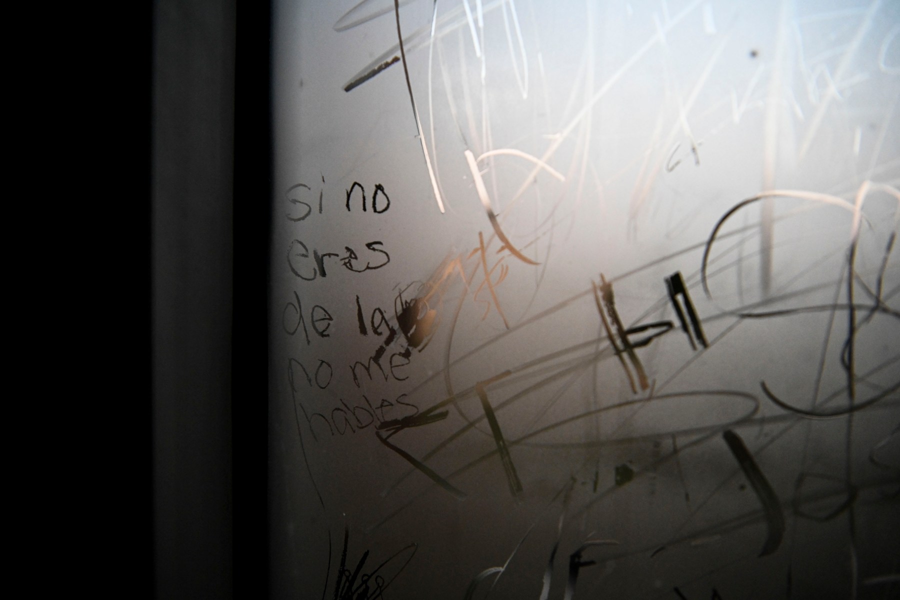 Graffiti con una etiqueta de pandilla MS-13 rayada, cerca de la casa de la