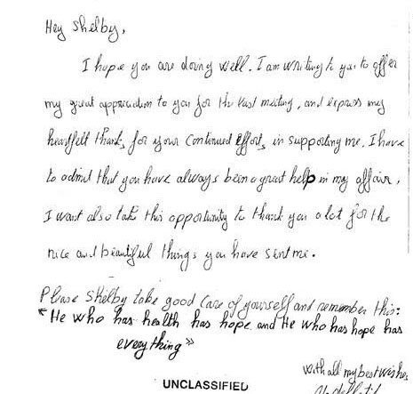 Cortesía de REPRIEVE Una nota de Nasser a su abogada, Shelby Sullivan-Bennis. |