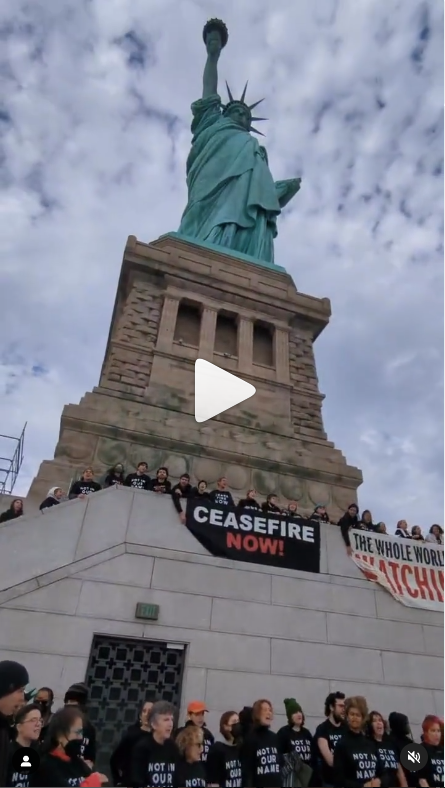 Hoy desde Jewish Voice for Peace: 500 judíos neoyorquinos y aliados acaban de celebrar una sentada de emergencia en la Estatua de la Libertad para pedir un alto el fuego inmediato en Gaza. Tomamos la isla. Pusimos fin a la normalidad. Nos acompañaron rabinos, cargos electos, celebridades, descendientes de supervivientes del Holocausto y niños. (A los que se unieron de nuevo Stephanie Rugoff y muchos otros amigos de El Mundo no Puede Esperar).