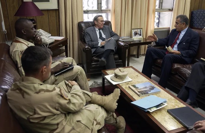 secretario de Defensa Donald Rumsfeld en una reunión en Kandahar, el 4 de