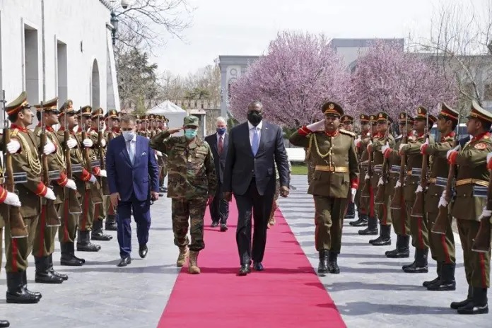 alfombra roja en Kabul el 21 de marzo con el ministro de Defensa afgano en funciones, Yasin Zia. [Fuente: apnews.com]