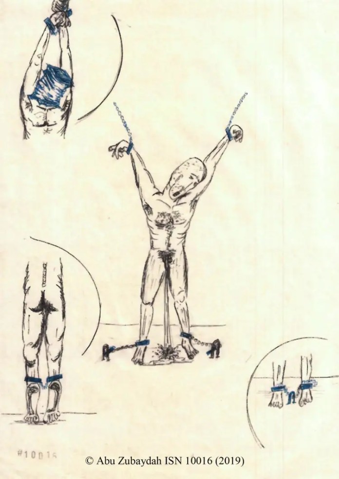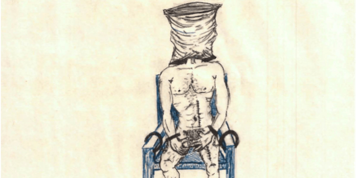 dibujando recreando la tortura que experimentó mientras estaba en una prisión