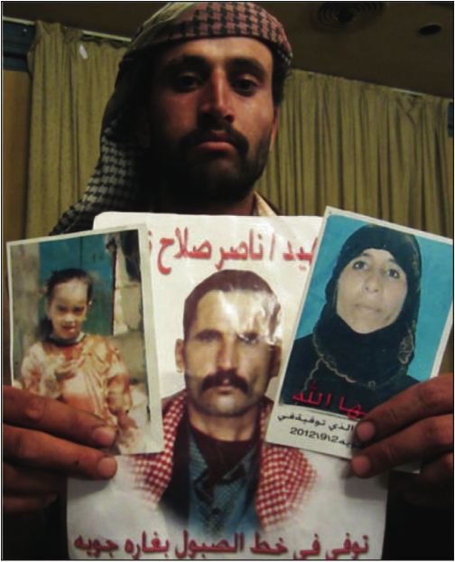 Saddam Hussain con una foto de su sobrina de nueve meses, asesinada por un ataque de
