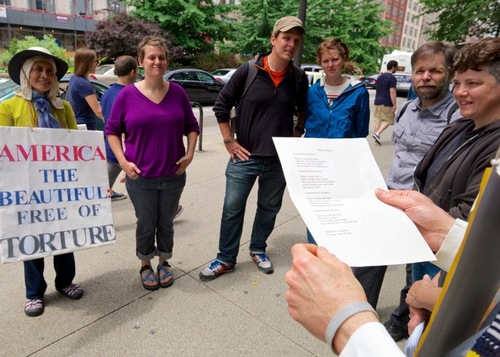 morir." Más tarde, miembros de Witness Against Torture se unieron a