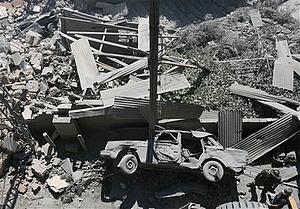 inspecciona los escombros de unos edificios derrumbados por un misil israelí en
