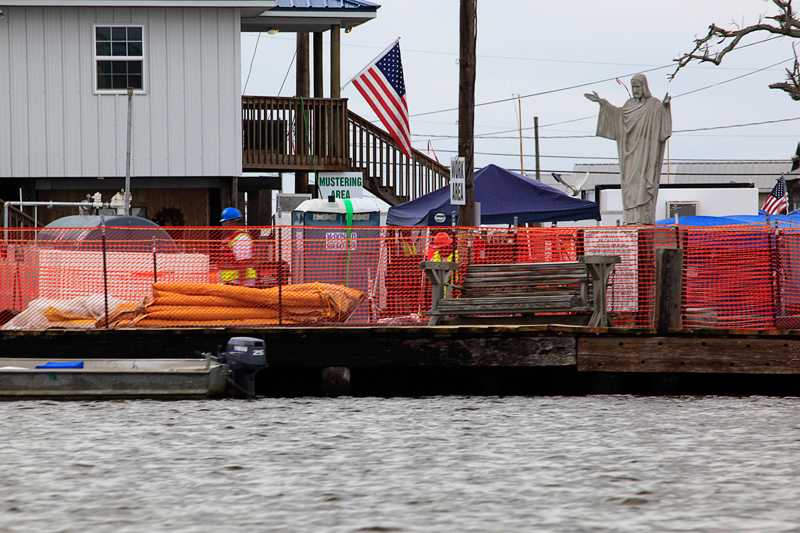 colocando la barrera flotante de BP, un trabajo que es temporal. Theresa me dice