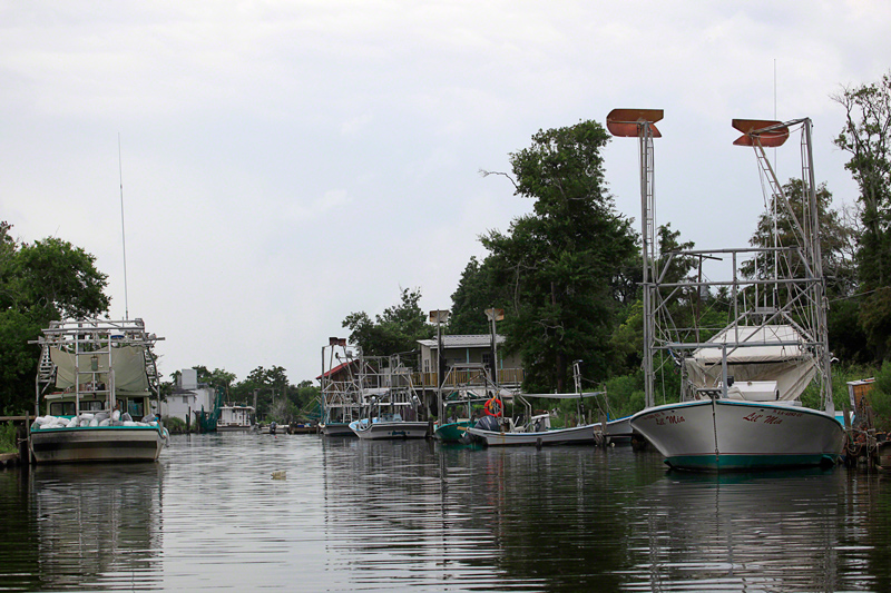 estrecha vía de agua flanqueada por barcos de pesca de camarón que sin el