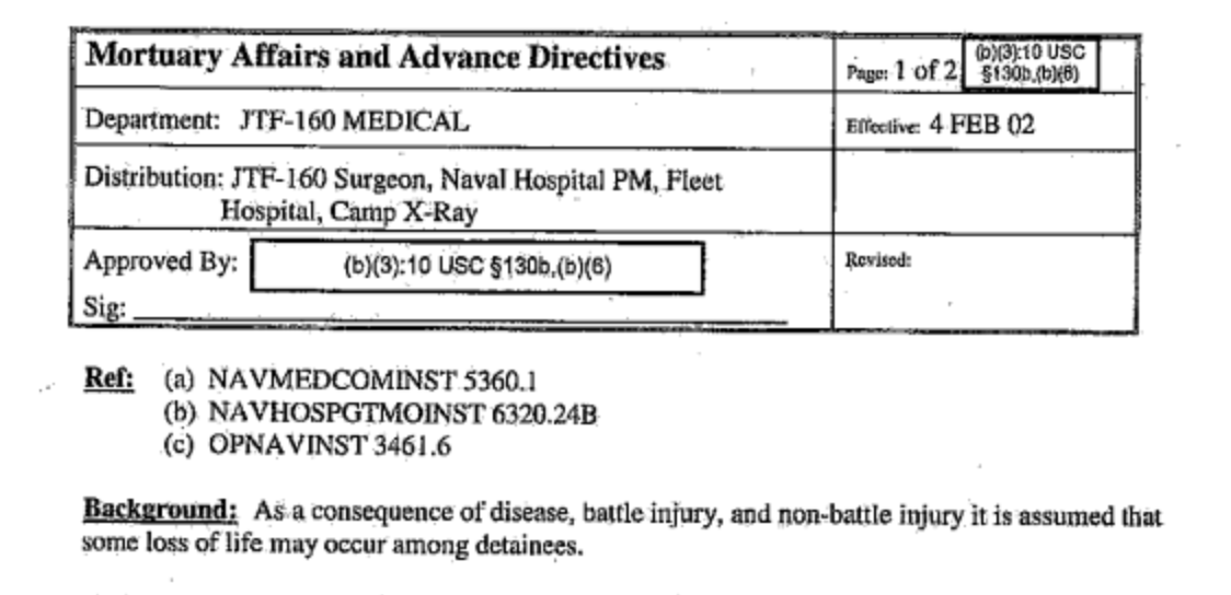 Según una directiva del 4 de febrero del 2002 a Camp X-Ray, de parte de la división de Asuntos Mortuorios en