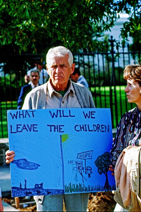 Phillip Berrigan sostiene un cartel antes de ser
