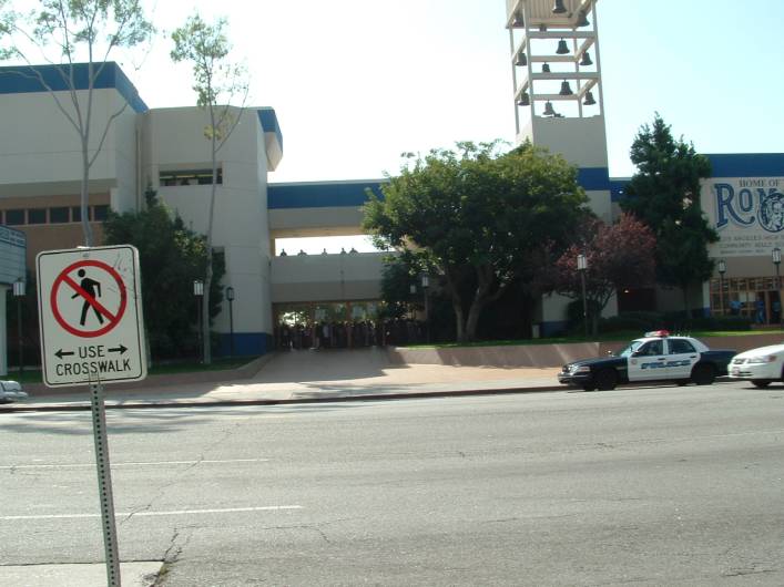 sidewalk adjacent to the school. We crossed the sidewalk and the bell rang for