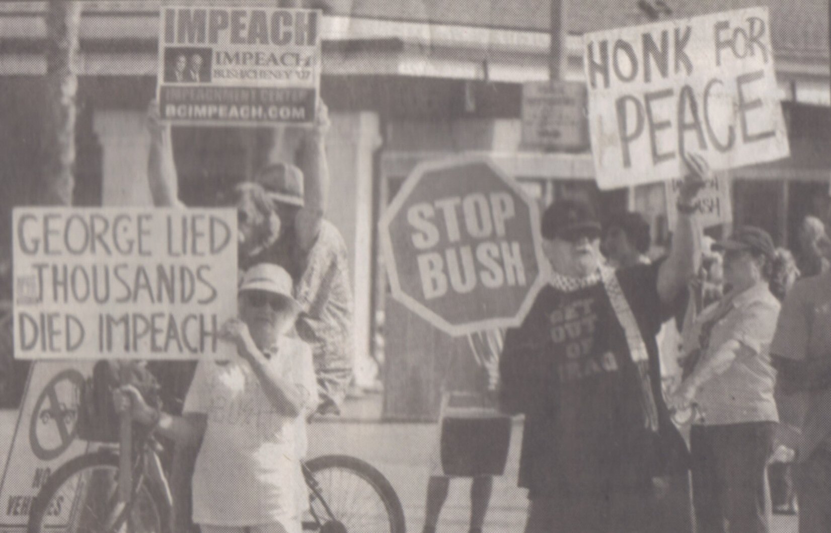Un centenar de manifestantes antibélicos de Huntington Beach irrumpieron la tarde de ayer el veraneo en esa bucólica ciudad playera con una demanda de juicio político al presidente George W. Bush por su conducta de la guerra en Irak.