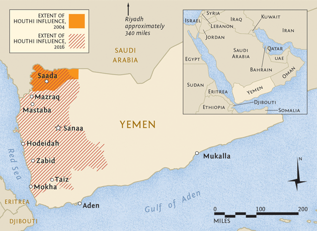 la influencia Houthi en Yemen desde el 2004 hasta el 2016.