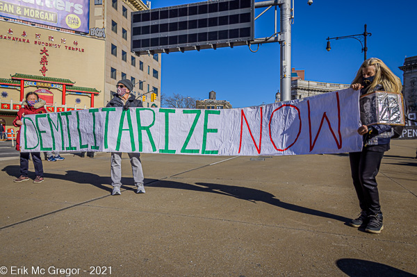 peatones del barrio, oponiéndose al círculo interminable de guerra y militarismo
