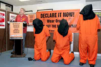 hooded actors who symbolize prisoners in Guantanamo Bay.