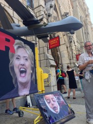 incluyendo un modelo de dron y pancartas grandes. Ninguna autoridad dijo una