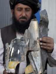 líder tribal paquistaní Karim Khan muestra los restos de un misil supuestamente