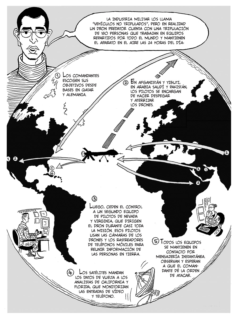 El equipo humano que opera los drones y ejecuta el disparo suele estar ubicado a miles de kilómetros del