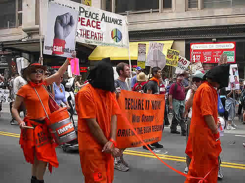 World Can't Wait was there in full spirited force, with a contingent that was led by orange jumpsuited activists in hoods (to represent Guantanamo detainees), followed by big orange drums beating out a rhythm to the chants that were full voiced and loud. “STOP IRAQ WAR, NO IRAN WAR, IMPEACH! IMPEACH! IMPEACH CHENEY AND BUSH!” Behind them came “the Bush Regime”; huge paper machet heads of Bush, Cheney, Rumsfeld, and Rice worn by new WCW volunteers with black and white striped prison suits. Other activists would shout...”Look out! Criminals on the loose!” The crowd would hiss and boo, as chanting would switch to “CRIMINALS! CRIMINALS! IMPEACH THE CRIMINALS!”