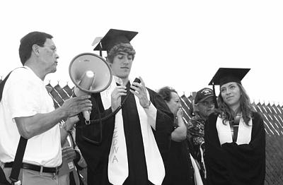 "Gracias a todos por estar en mi graduación", dijo a la multitud con sarcasmo