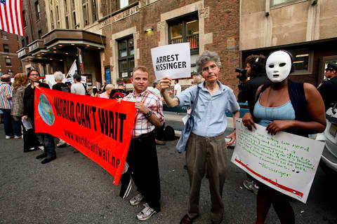 protesta para pedir el arresto de Kissinger por crímenes de guerra. El activista