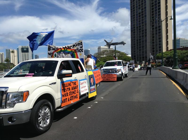 El primer camión estaba decorado con grandes fotos de Bradley Manning, junto con pancartas en las que se leía "Decir