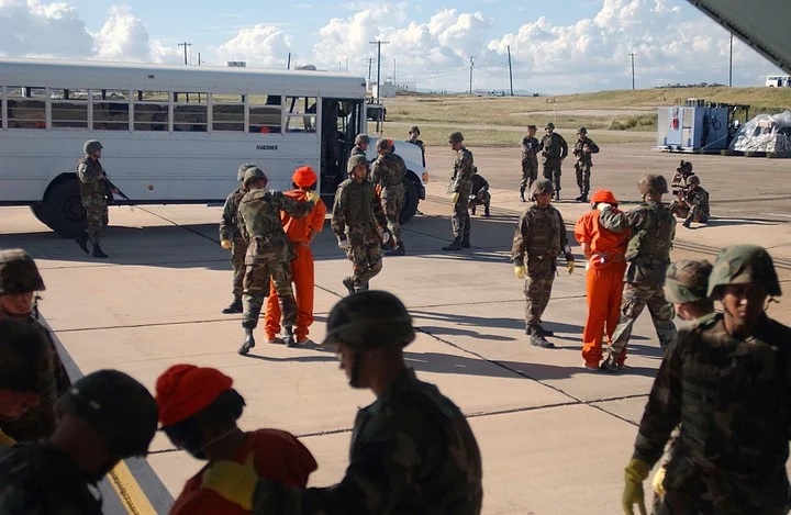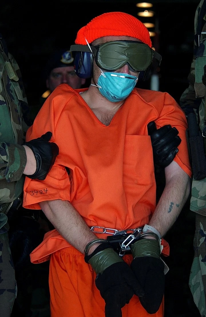 Los primeros 20 detenidos llevados a la Base Naval de la Bahía de Guantánamo;. Foto