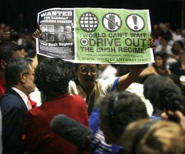 Wait" para gritarle al orador que el régimen de Bush debe desaparecer.