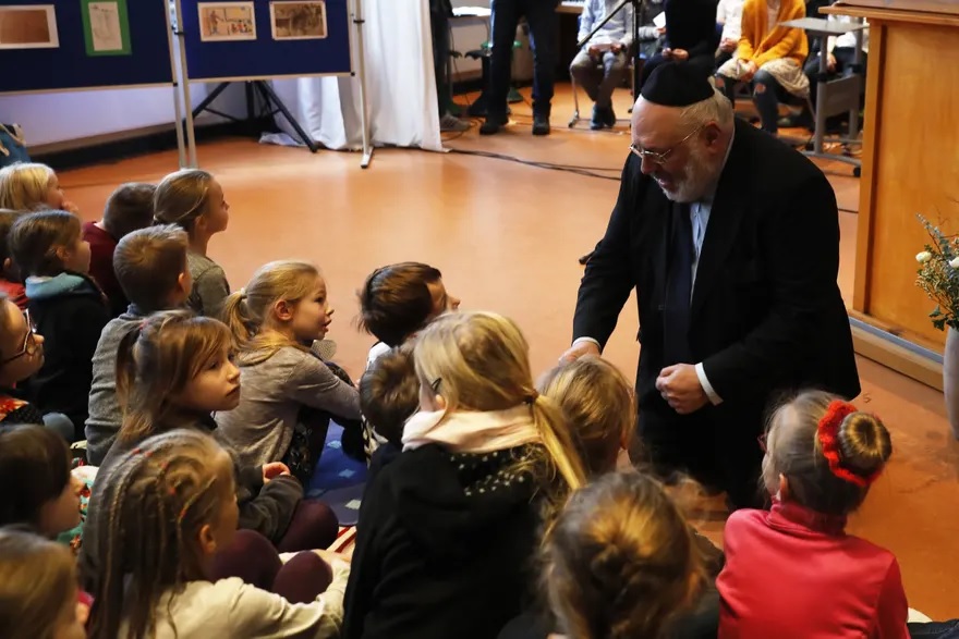 El rabino Walter Rotschild habla con los escolares que
