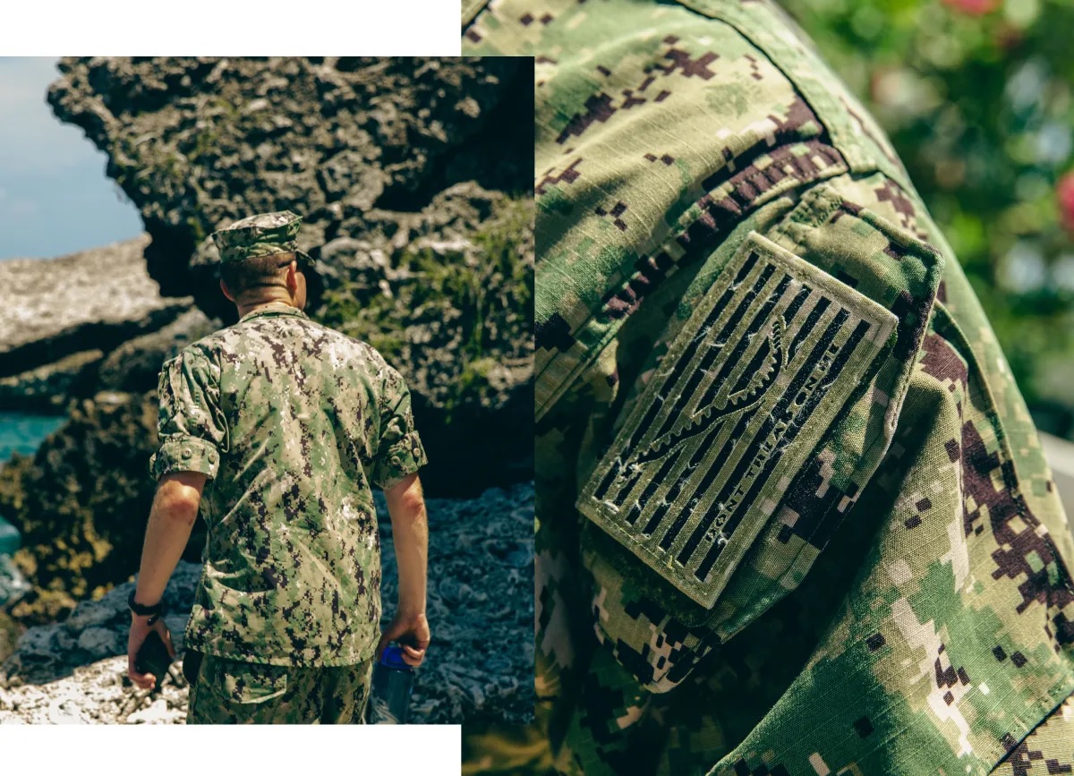 lleva un parche de "Don't Tread on Me" en su uniforme de la Marina, a