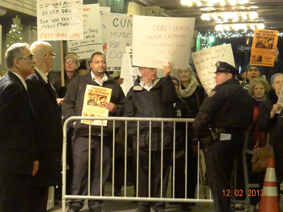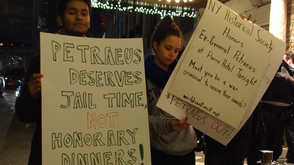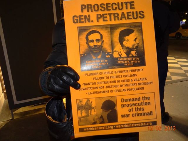 David Petraeus tiene las manos manchadas de sangre por los crímenes de guerra que cometió. Gracias a WarCriminalsWatch.org por organizar esta protesta.