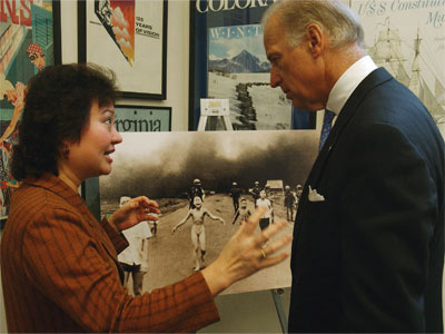 el entonces senador Joe Biden, se encuentra en frente de la famosa fotografía de sí misma como niña, quemada por