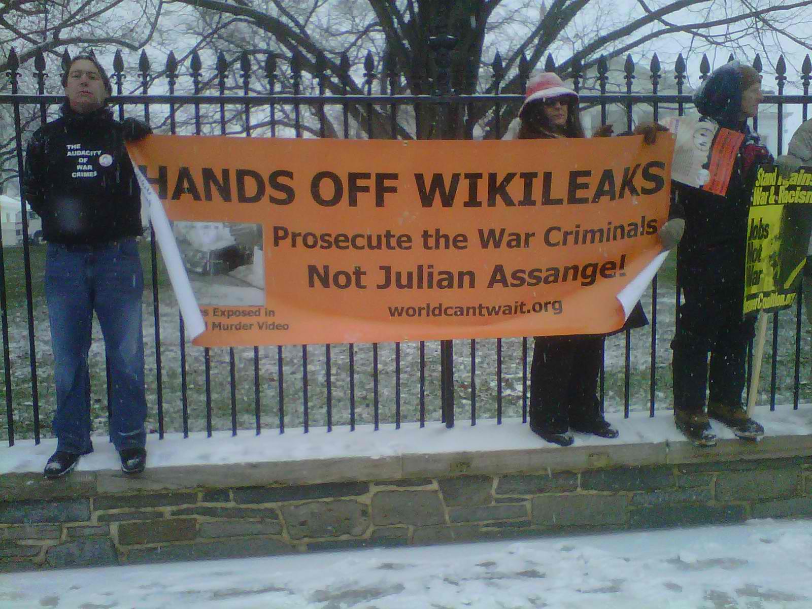 otra que decía: "Manos fuera de Wikileaks - Procesar a los criminales de guerra