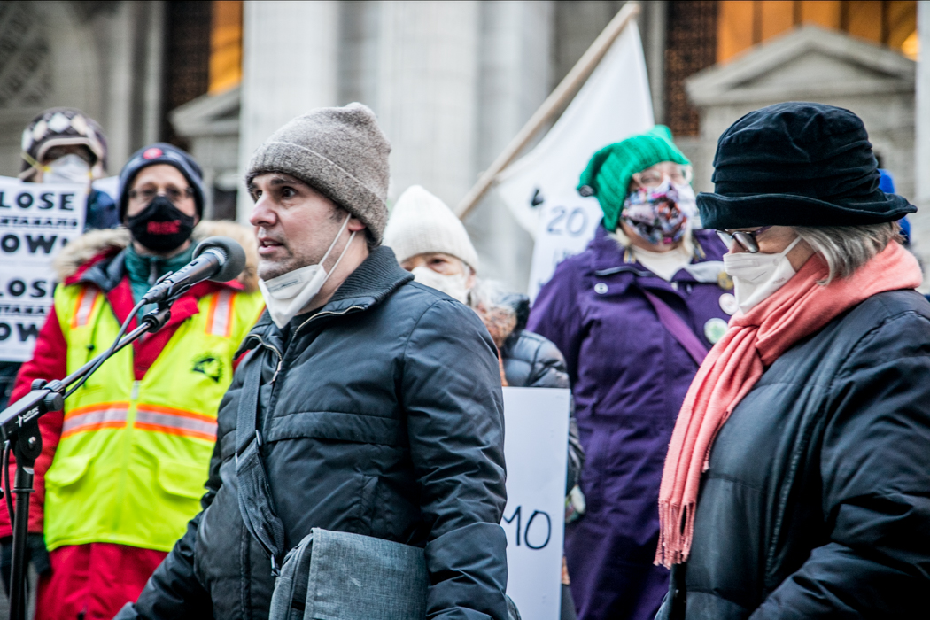 York, ahora, iniciada por World Can't Wait, afuera de la biblioteca