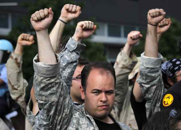 gritando lemas militares contra la guerra.